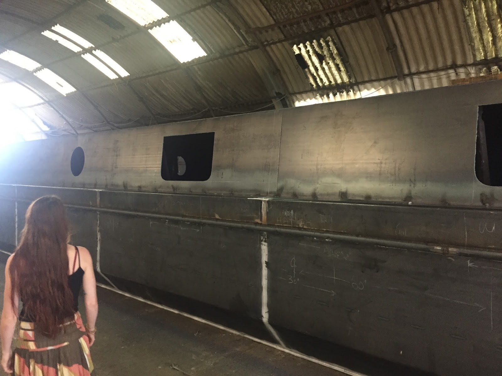 Self-explanatory - Emily taking her first stroll on the roof of the boat and the bow. There's also a picture of the inside of the boat, with all of the supporting struts still in place. These will be removed with the exception of one pole, which Richard is hoping to be allowed to keep.